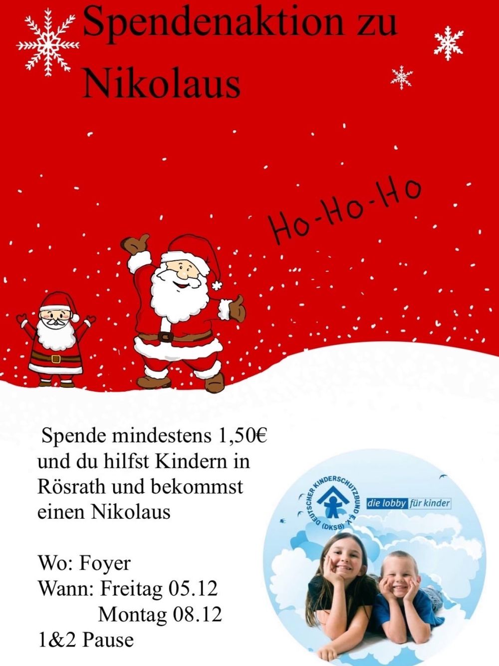 Wir als SV sammeln seit einigen Jahren zu Nikolaus Spenden für den guten Zweck. Auch dieses Jahr hoffen wir, mit den Einnahmen der Spendenaktion zu Nikolaus etwas Gutes zu bewirken. Dieses Jahr geht der Erlös an den Kinderschutzbund in Rösrath. Warum? Der Kinderschutzbund setzt sich für unsere – also die Rechte und Interessen von Kindern und Jugendlichen – ein. Es gibt kostenlose Beratungen für Jung und Alt: Jeder, der Probleme hat, findet dort ein offenes Ohr, sowohl Jugendliche als auch Eltern. Er dient als Anlaufstelle für Kinder und Jugendliche, die sich in einer schwierigen Lebenslage befinden und nach Unterstützung suchen.