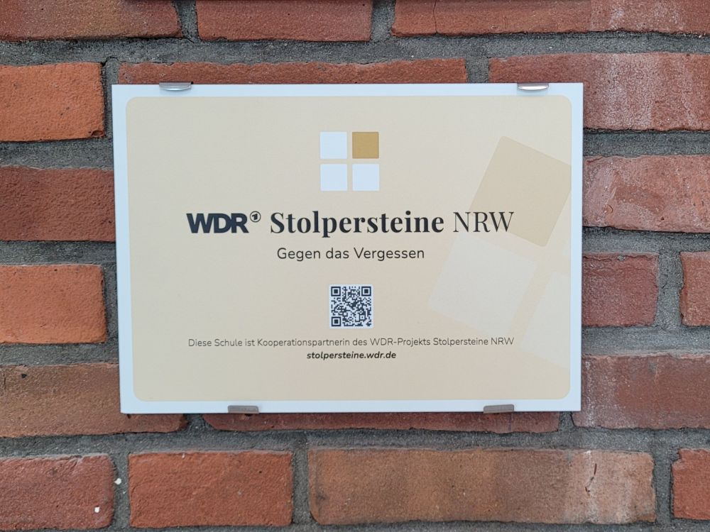 2023 haben Schüler:innen aus dem Zusatzkurs Geschichte (Abitur 2024) von Frau von Gaertner an der Gedenkveranstaltung zu Verlegung der ersten Stolpersteine in Rösrath mitgewirkt, für die sich der Geschichtsverein von Rösrath mit unserer ehemaligen Kollegin Marina Wittka eingesetzt hatte. Schüler:innen aus der dem KuLi-Kurs der damaligen Stufe 10, jetzt Q1, von Frau Schmidt haben zu den Lebensläufen der drei Opfer des Nationalsozialismus Graphic Novels gezeichnet, die über die App des WDRs zu den Stolpersteinen in NRW digital abgerufen werden können. Daher sind wir nun anerkannt als Kooperationsschule des Projekts „WDR Stolpersteine NRW“ und damit eine der Schulen, die sich aktiv für Erinnerungskultur, Vielfalt und Demokratie engagieren und ein Zeichen gegen das Vergessen setzen. Im Foyer verdeutlich dies nun auch eine Plakette.